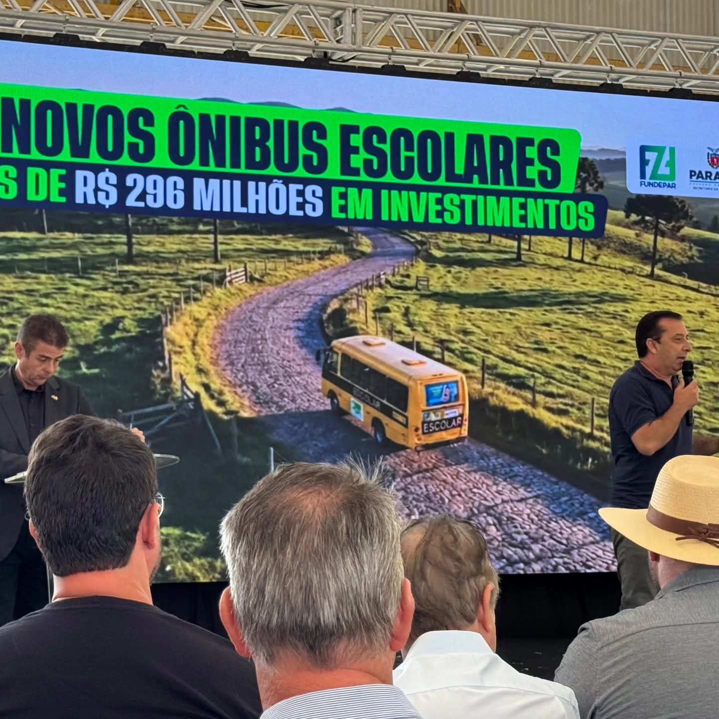 Durante a solenidade, Macadame participou do ato de entrega de ônibus escolares destinados aos municípios, reforçando o compromisso com a educação e o transporte de estudantes em todo o estado.